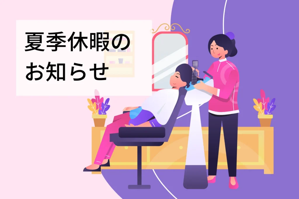 平素より当サロンをご愛顧いただき、誠にありがとうございます。夏季休暇につきまして、下記の通りご案内いたします。 休業期間:8月13日(火)〜8月16日(金) 8月17日(土)より通常営業いたします。 休業期間中はご不便をおかけいたしますが、スタッフ... -